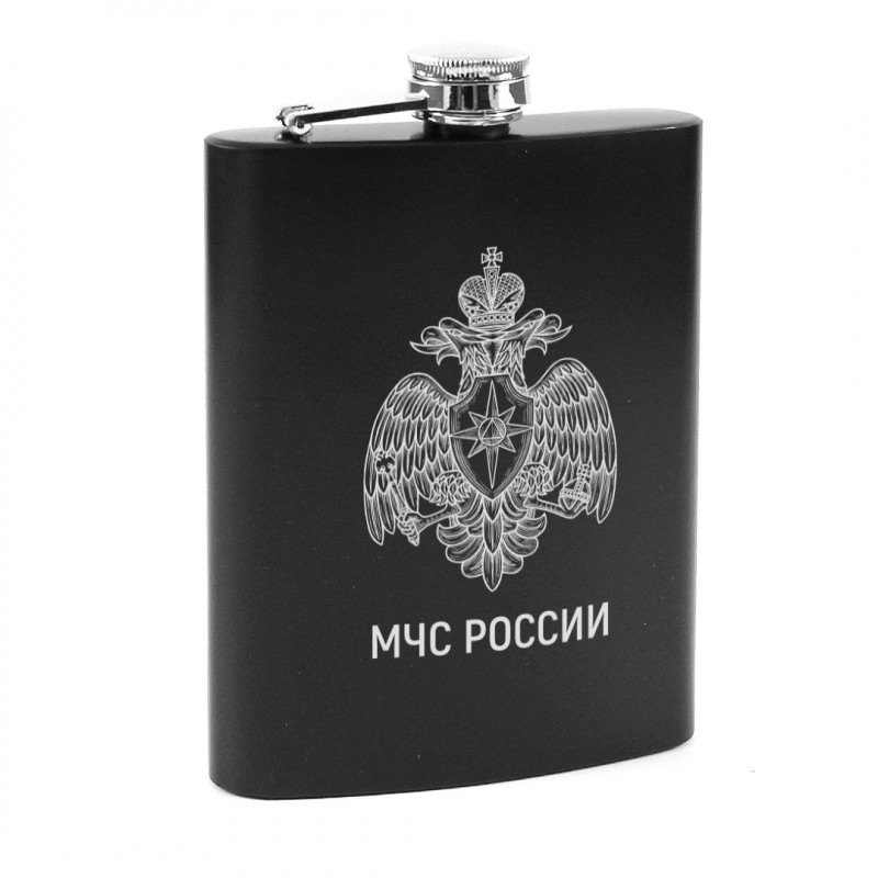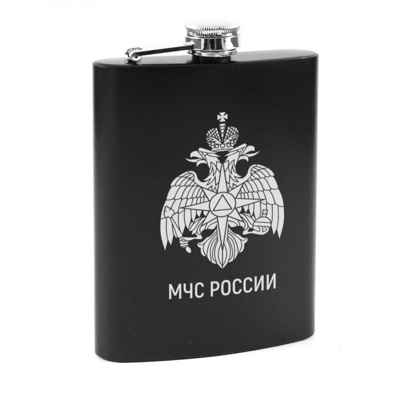 Прочная стальная фляга в матовом чёрном покрытии с официальной символикой МЧС России на лицевой стороне. Лазер выжигает верхний полимерный слой, создавая контрастный белый (стальной) рисунок. Гравировка не стирается, не выцветает и не боится влаги, сохраняя чёткость контуров при активной эксплуатации.