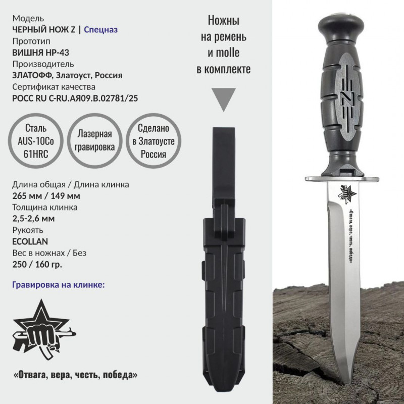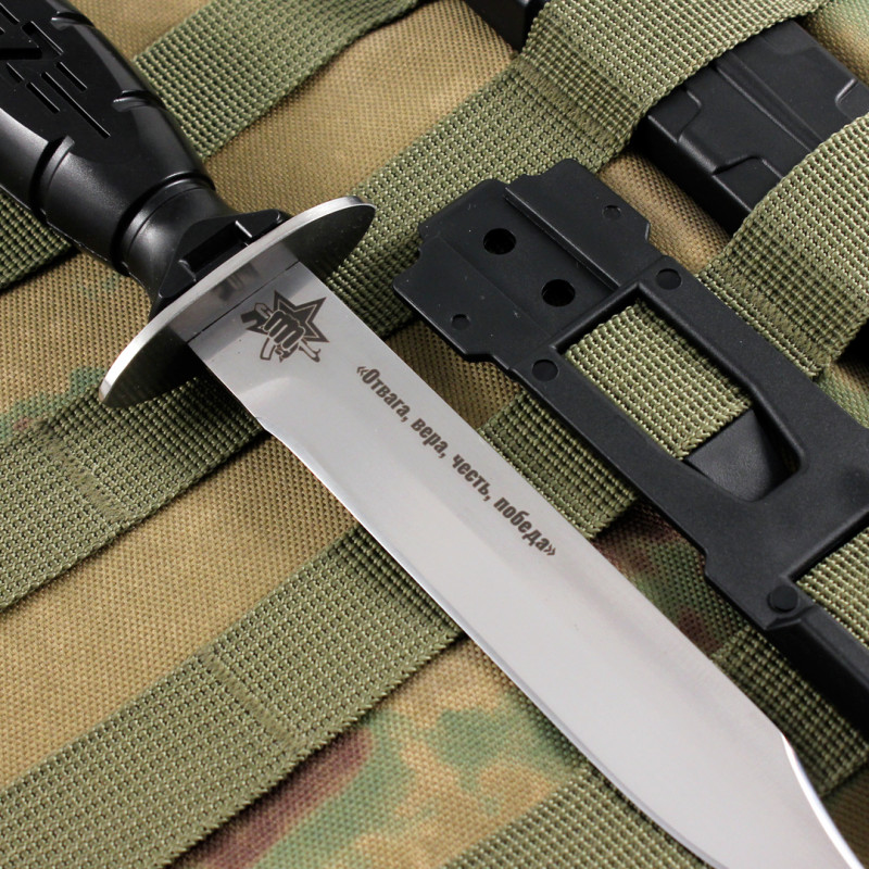 Нож имеет несколько конструктивных особенностей, которые разработаны нами для усиления его конструкции и возможности крепления на армейскую амуницию, системы molle. Не является холодным оружием, свободная продажа и ношение.